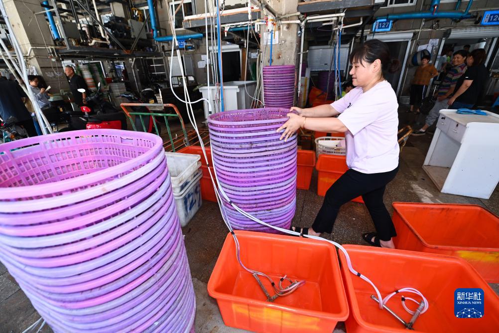 8月6日,舟山國(guó)際水產(chǎn)城海鮮活品經(jīng)營(yíng)戶(hù)在為迎接開(kāi)漁后首批漁獲做準(zhǔn)備工作。