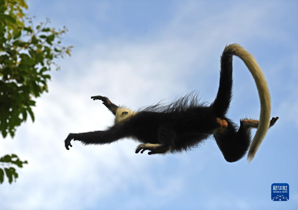 一只白頭葉猴在林間跳躍(8月5日攝)。