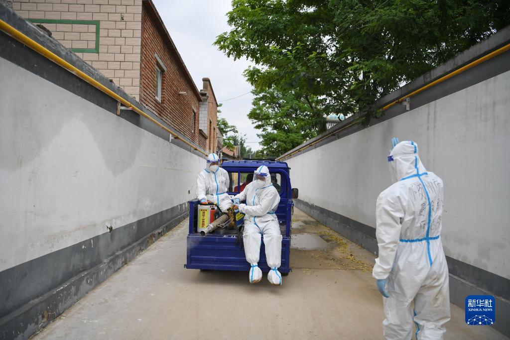 8月6日,在河北省涿州市刁窩鎮白塔村,防疫人員在進行道路消殺作業。