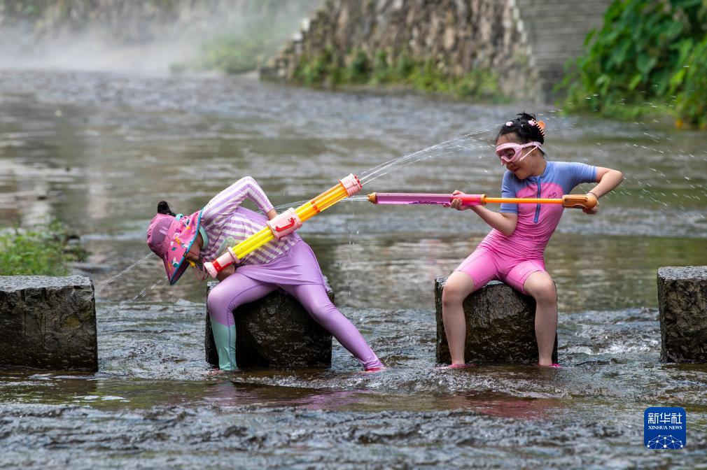 8月5日,在浙江省金華市磐安縣安文街道花溪村,兩名孩子在嬉水。