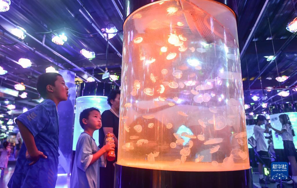 8月6日,家長帶著孩子在河南洛陽龍門海洋館參觀。