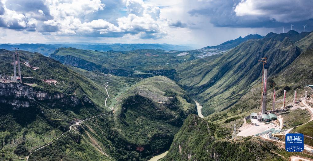 正在修建中的花江峽谷大橋5號主塔(右)(8月2日攝,無人機照片)。