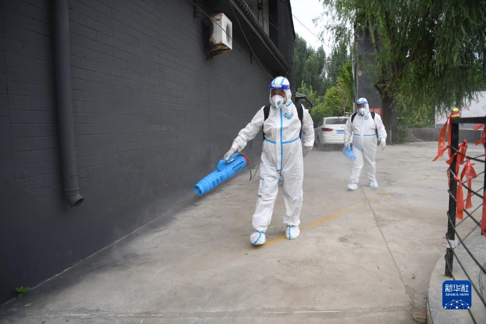 8月8日,工作人員在涿州市桃園街道忠義店村開展防疫消殺作業。