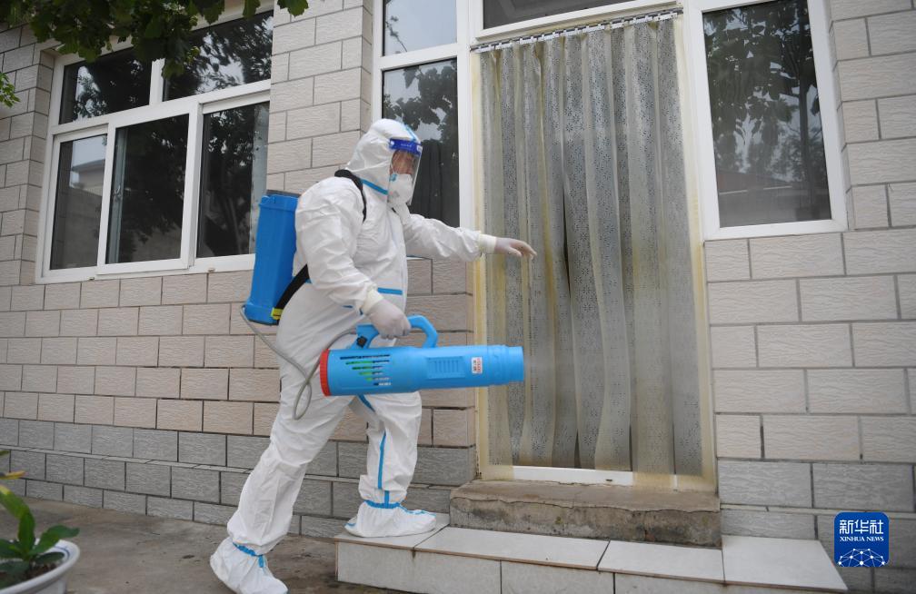 8月8日,工作人員在涿州市桃園街道忠義店村入戶開展防疫消殺作業。