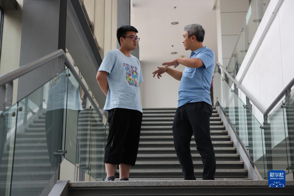 7月21日,在位于安徽合肥的中國科學(xué)技術(shù)大學(xué),彭承志(右)在第十四屆物理與化學(xué)夏令營微尺度分營上作報(bào)告后與參加夏令營的學(xué)生交談。