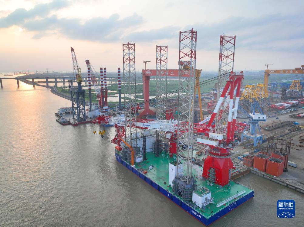 該風電安裝平臺長133.8米,型寬50米,型深11米,總重約28000噸,艉部右舷設2500噸繞樁式全回轉起重機,適用于砂性土、粘性土或類似地質作業,主要用于15兆瓦及以上機組設備安裝,可同時運載2套15兆瓦風機機組設備,最大作業水深70米。新華社發(許叢軍 攝)