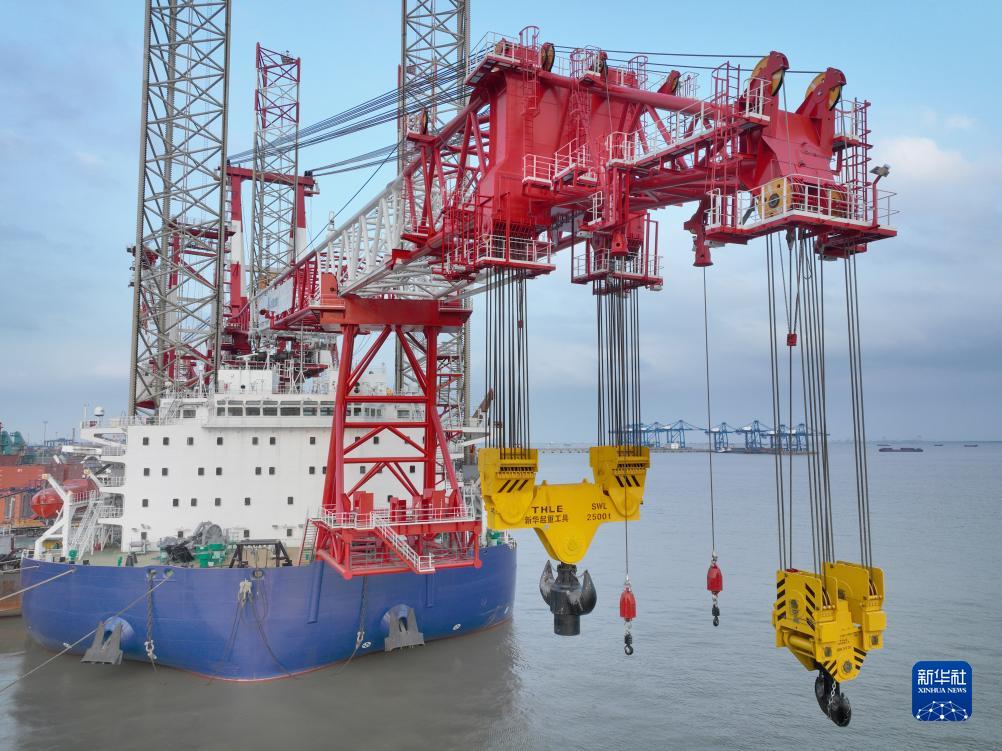 8月8日在振華南通重裝碼頭拍攝的中交海峰2500噸自升自航式風電安裝平臺“海峰1001”(無人機照片)。新華社發(許叢軍 攝)