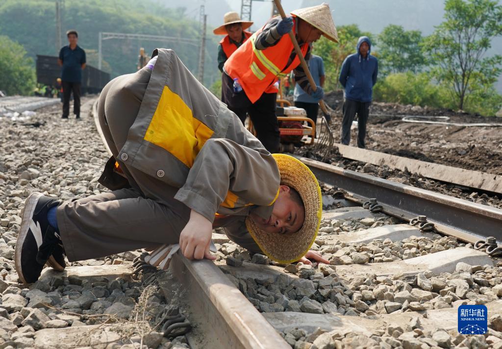 8月8日,一名工作人員在檢查搶修后的鐵軌,確保通車順利。