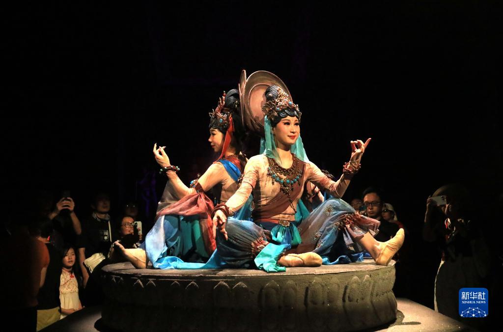 8月5日晚,游客在甘肅省敦煌市觀看大型洞窟式沉浸體驗劇《樂動敦煌》。
