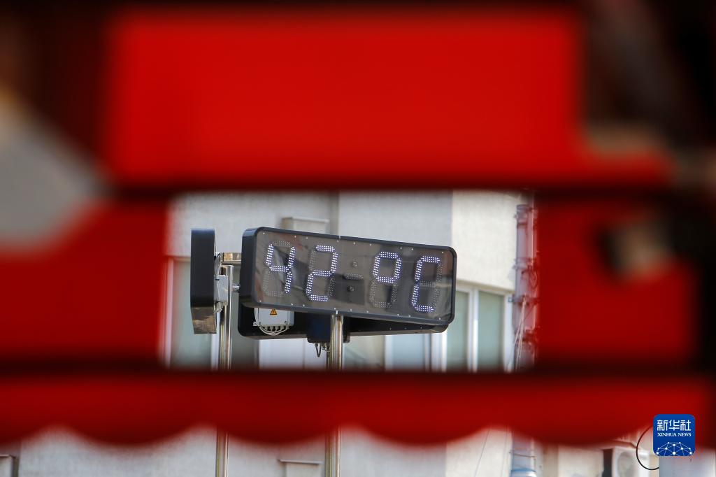 這是7月25日在羅馬尼亞布加勒斯特街頭拍攝的溫度指示牌。