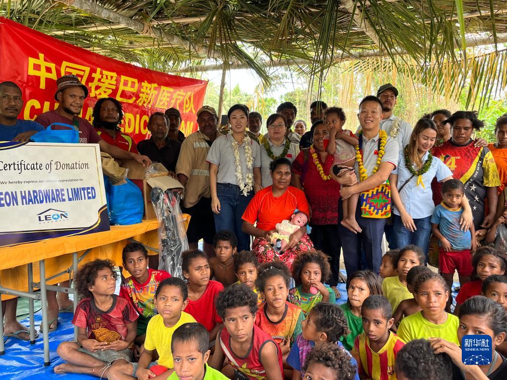 8月5日,在巴布亞新幾內亞中央省的一個村莊里,第12批援巴新中國醫療隊隊員和當地村民一起參加泰樂的百日宴。