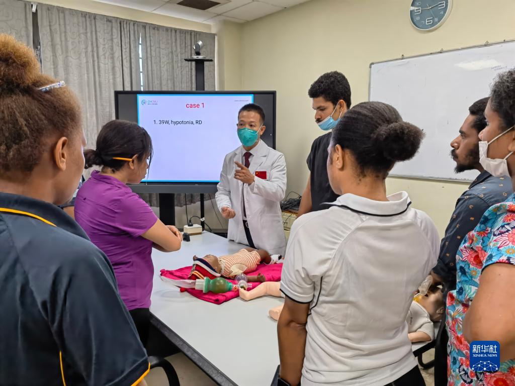 2022年12月16日,在巴布亞新幾內(nèi)亞新愛爾蘭省,第12批援巴新中國醫(yī)療隊(duì)副隊(duì)長劉振球?yàn)楫?dāng)?shù)蒯t(yī)護(hù)人員進(jìn)行新生兒復(fù)蘇操作培訓(xùn)。