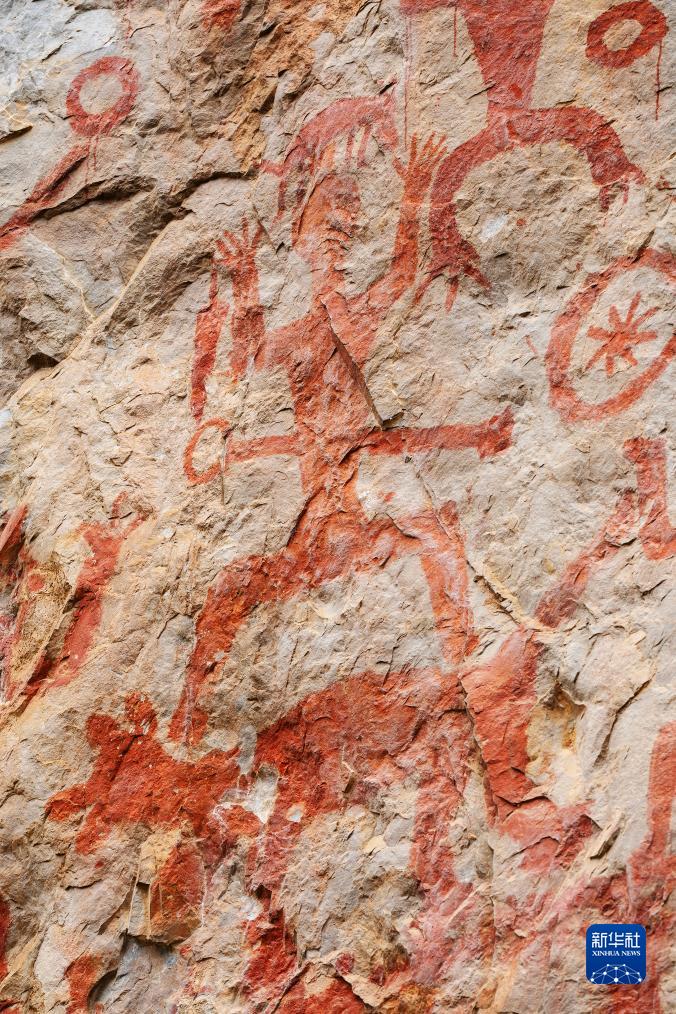 8月8日拍攝的巖畫局部。朱秋平介紹說:“這幅畫是花山巖畫里面最具有代表性的一幅。畫的中心位置是一個首領,腰間配掛的是一把環首刀,他的右手還拿著一把扁莖短劍,頭上有羽飾,腳下是一個非常碩大的類狗的動物,其他人就圍繞著他進行一些活動?!?/p>