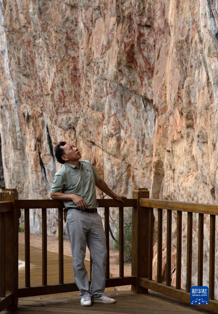 8月8日,廣西寧明縣文物管理所所長朱秋平在觀察巖畫。