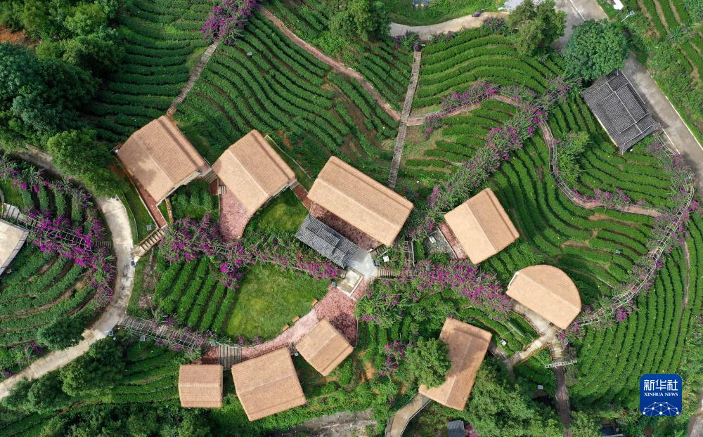 這是融水苗族自治縣融水鎮新安村水融香茶園茶葉種植基地(無人機照片,8月9日攝)。民宿、花廊、茶文化體驗館等文旅設施位于茶山上。