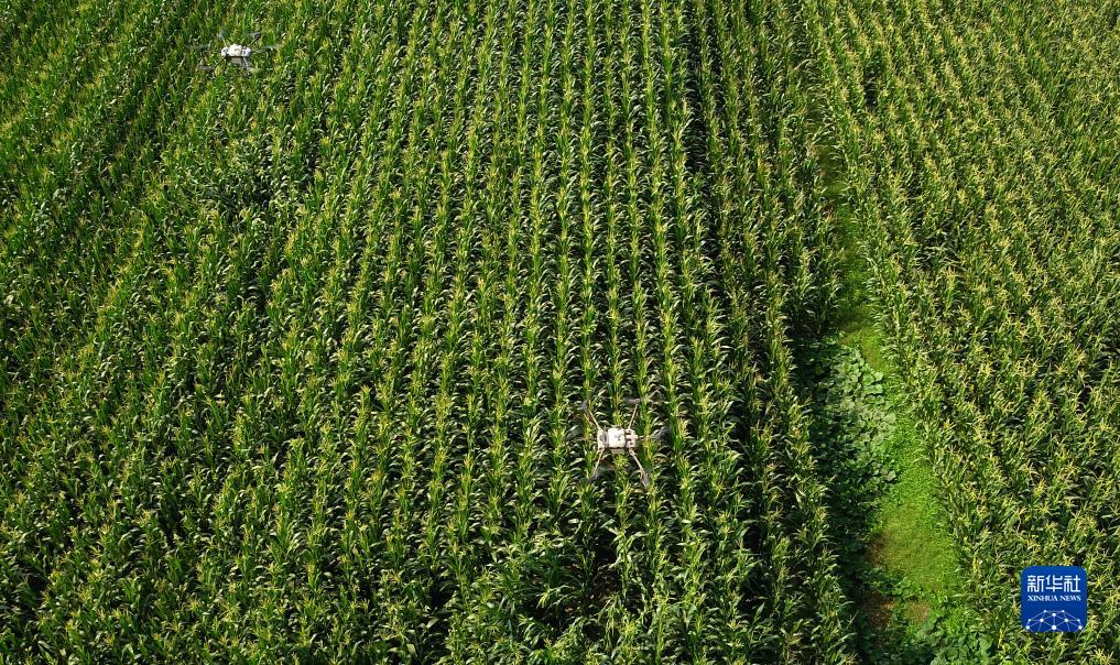 8月9日,在山東省成武縣孫寺鎮,農用植保無人機在玉米種植田上空進行飛防作業(無人機照片)。