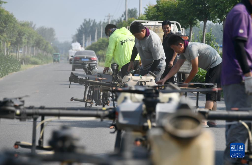 8月9日,在山東省成武縣孫寺鎮,無人機操作手在做起飛前的準備工作。