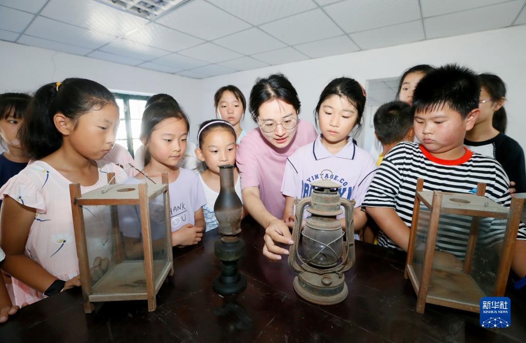 8月9日,在山東省青島市即墨區(qū)龍山街道前東葛村村史館,一名志愿者向小學生講解煤油燈的歷史。
