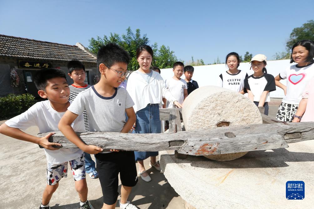 8月9日,山東省青島市即墨區龍山街道的小學生在前東葛村村史館體驗推石磨。
