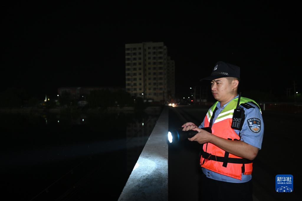 8月9日凌晨,在天津市靜海區臺頭鎮革命橋上,天津市公安局靜海分局執勤民警查看大清河河面情況。