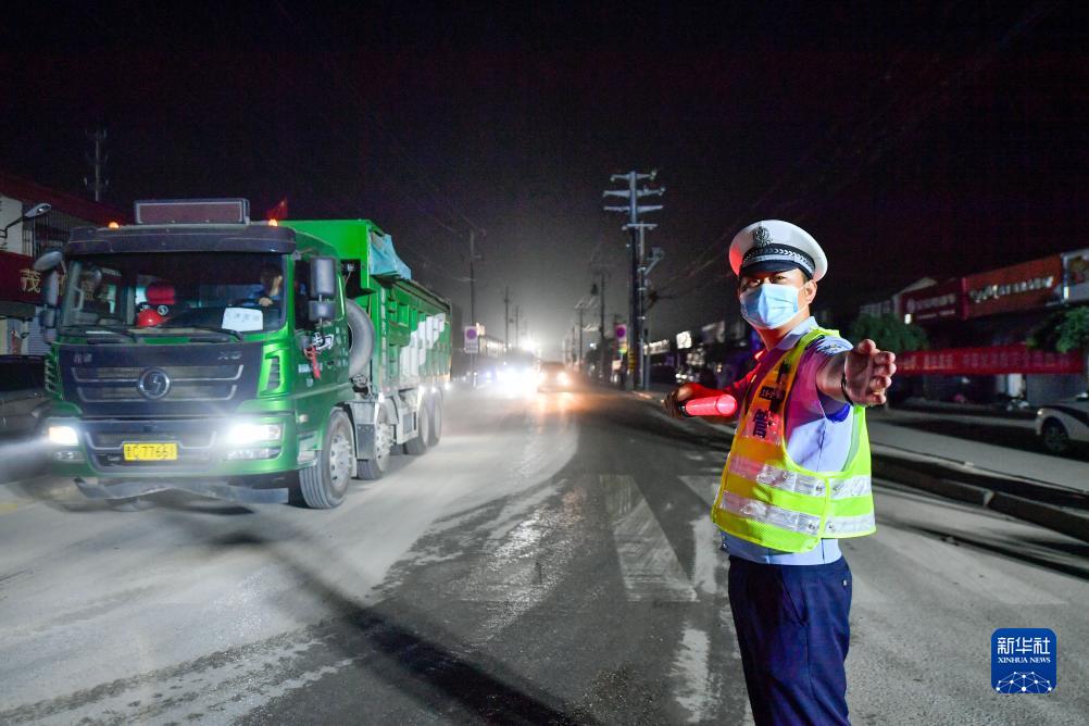 8月9日凌晨,交警在天津市靜海區臺頭鎮一處十字路口指揮工程車輛進入作業現場。
