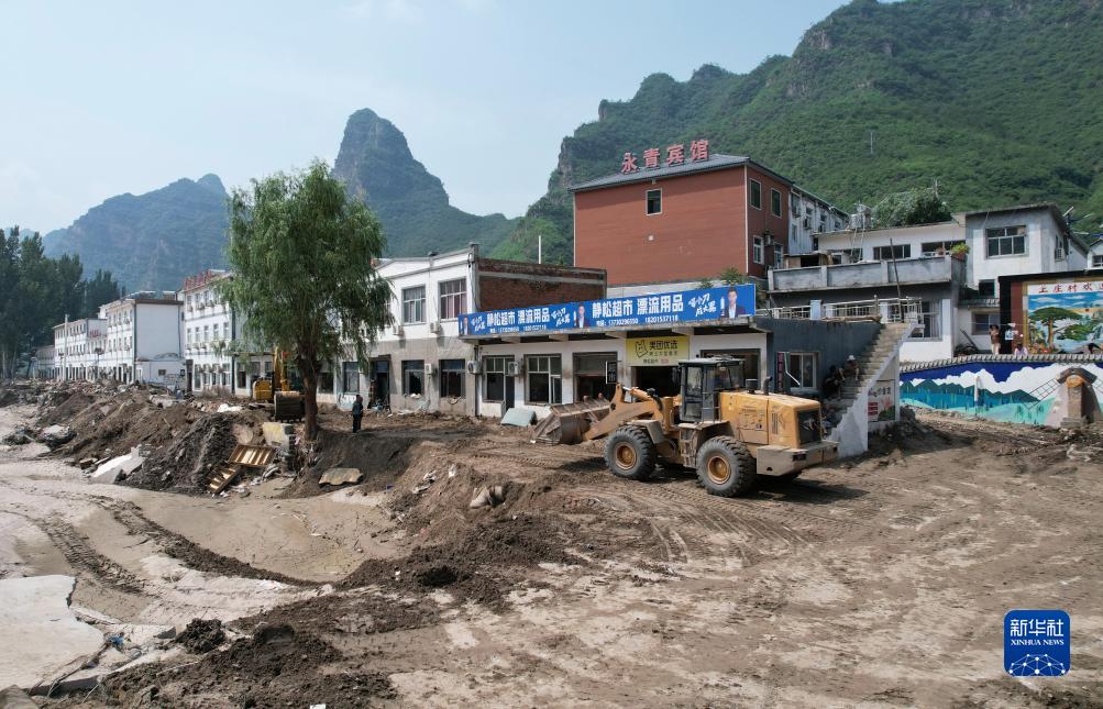 8月9日,工人操作機械設備搶修通往淶水縣三坡鎮上莊村的道路(無人機照片)。