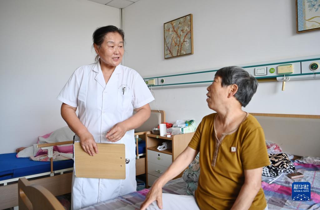 8月9日,醫務人員在海福祥養老護理院安置點內叮囑老人用藥。
