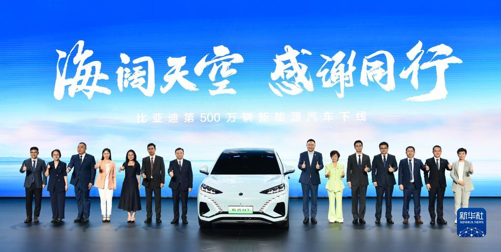 8月9日,嘉賓共同見證比亞迪第500萬輛新能源汽車下線。新華社記者 梁旭 攝