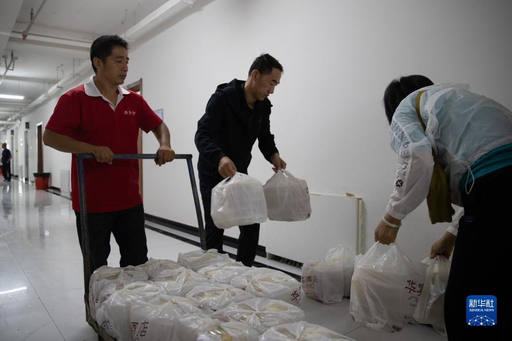 8月10日,在五常市時代中學集中安置點,工作人員在搬運早餐。