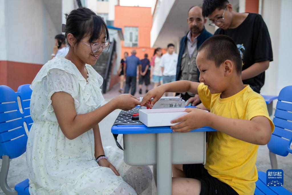 8月9日,小朋友在五常市時代中學集中安置點下棋。