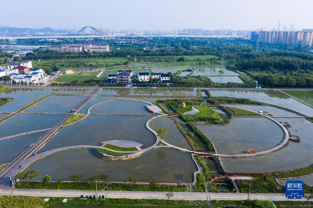 8月9日拍攝的寧波市鎮海區莊市街道永旺村的稻田景觀帶(無人機照片)。永旺村通過盤活農村閑置農田和農房,完善“農業+”鄉村旅游產業鏈,并引入科創文創產業,打造集零售、餐飲、休閑等服務功能于一體的特色商業街,不斷豐富鄉村業態,走出一條獨具特色的共富新路子。