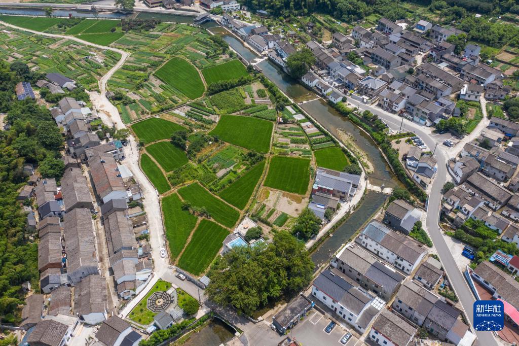 8月10日拍攝的群山環繞的寧波市鄞州區城楊村,該村是寧波“最美精品線路”的重要節點(無人機照片)。2020年城楊村積極推動特色鄉村旅游產業發展,集體經濟年收入從不足10萬元發展到如今年收入已超50萬元,每年接待游客超15萬人次。