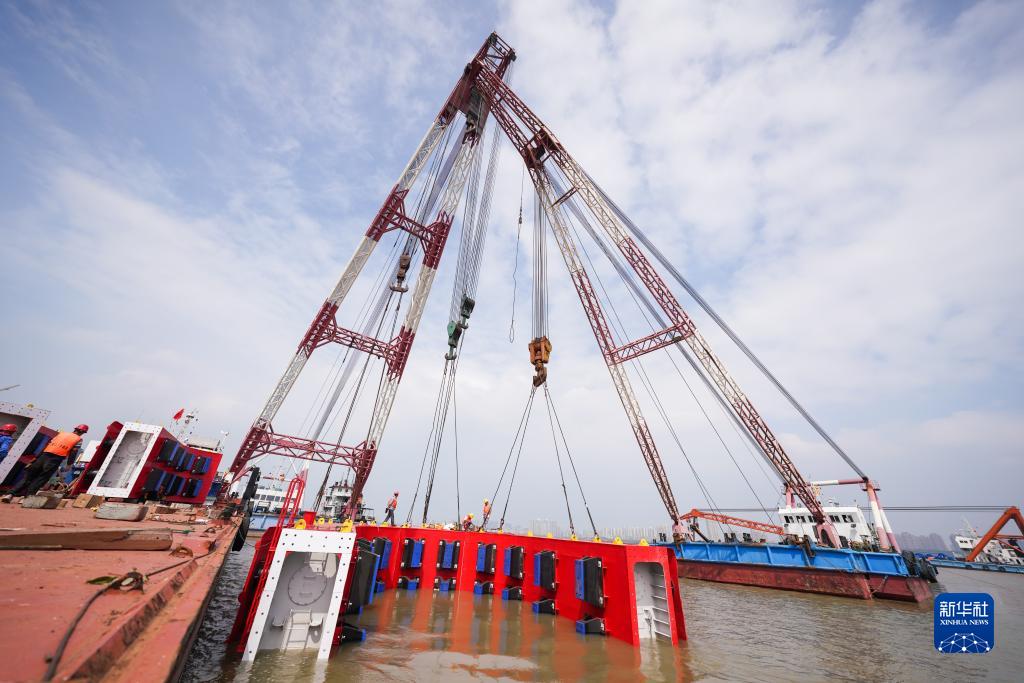 8月9日,中國鐵路上海局集團有限公司工作人員在南京上元門碼頭對南京長江大橋橋墩防撞設施進行組裝。