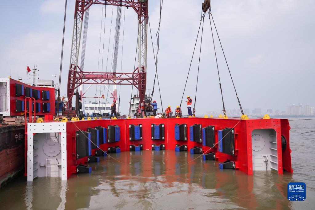 8月9日,中國鐵路上海局集團有限公司工作人員在南京上元門碼頭對南京長江大橋橋墩防撞設施進行組裝。