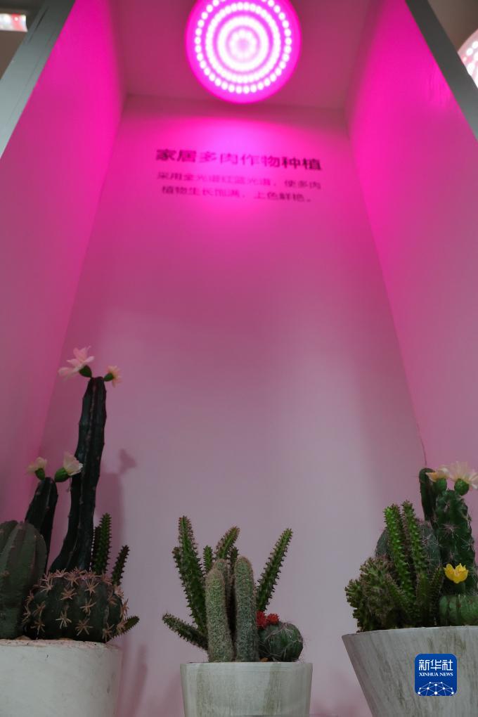 這是佛山照明產品展廳內展示的促進多肉作物生長和著色的植物照明設備(8月8日攝)。