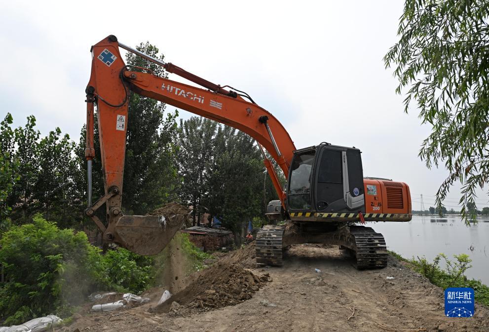 8月10日,在天津市靜海區(qū)大清河臺頭段南堤,工程機械設備在堤壩上作業(yè)。