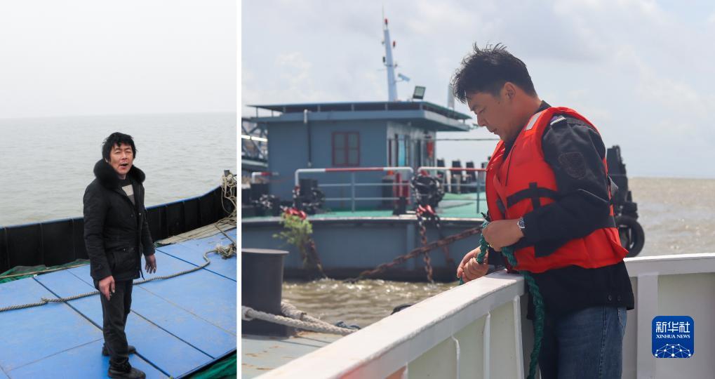 拼版照片:左圖為2017年3月10日,上海市崇明區向化鎮六滧港漁業村村民張紅偉站在漁船甲板上(資料照片)。右圖為2023年7月26日,在上海市崇明區長江口江面,擔任中國漁政31101船大副的張紅偉在船上整理纜繩(鄭佳慶 攝)。
