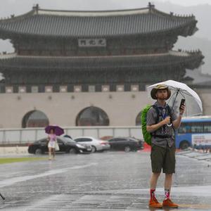 8月10日,游客撐傘走在韓國首爾光化門廣場。