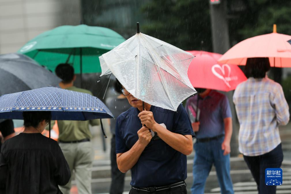 8月10日,在韓國首爾,人們在雨中過馬路。