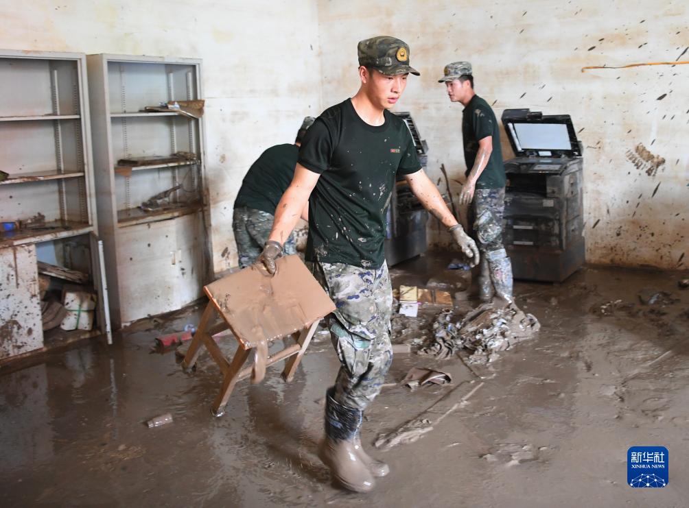 8月10日,武警河北總隊保定支隊戰士在涿州中學教學樓清理物品。