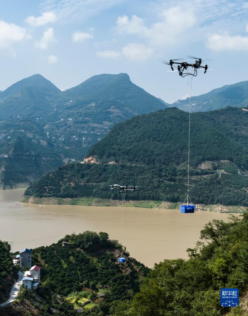 8月10日,技術人員在秭歸縣泄灘鄉坊家山村幫當地村民轉運柑橘(無人機照片)。