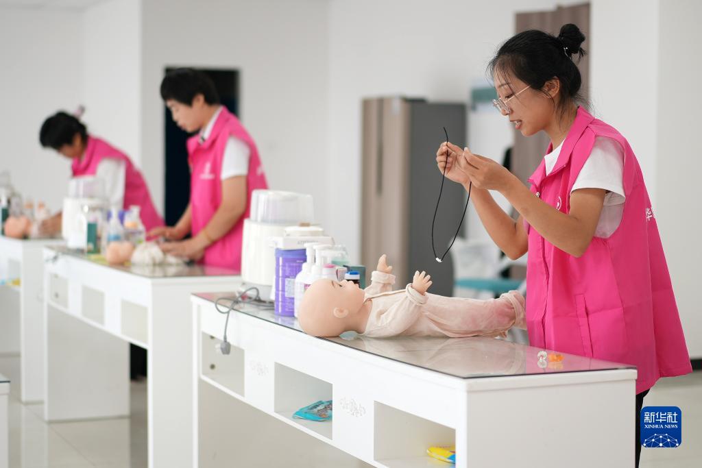 8月11日,在河北省滄州市新華區巾幗家政服務技能大賽比賽現場,參賽人員展示育嬰技能。