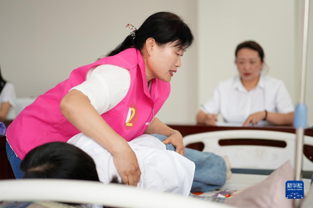 8月11日,在河北省滄州市新華區(qū)巾幗家政服務(wù)技能大賽比賽現(xiàn)場,參賽人員展示養(yǎng)老護(hù)理技能。