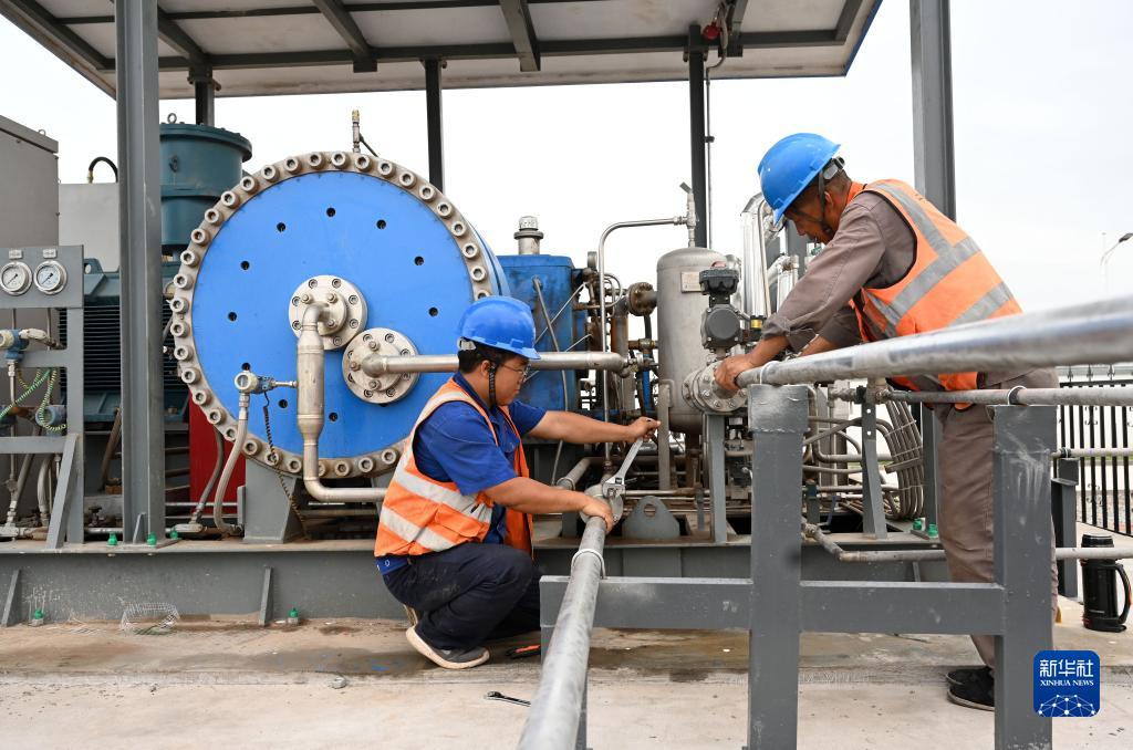 8月10日,工人在中國(guó)能建張掖氫能綜合應(yīng)用示范項(xiàng)目調(diào)試氫氣加壓裝置。