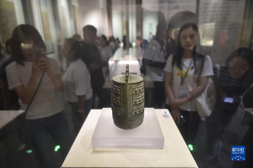 8月9日,觀眾在河南省開封市博物館里參觀“大晟夷則”銅編鐘。