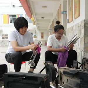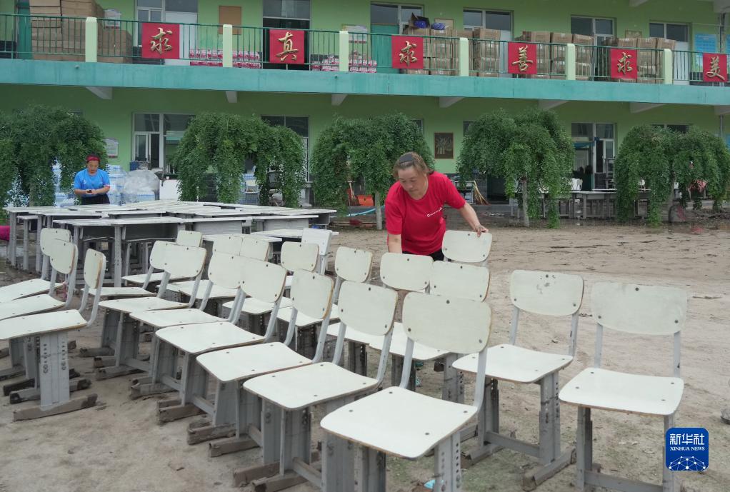 8月11日,在河北省淶水縣其中口鄉(xiāng),學校老師在擦洗桌椅。