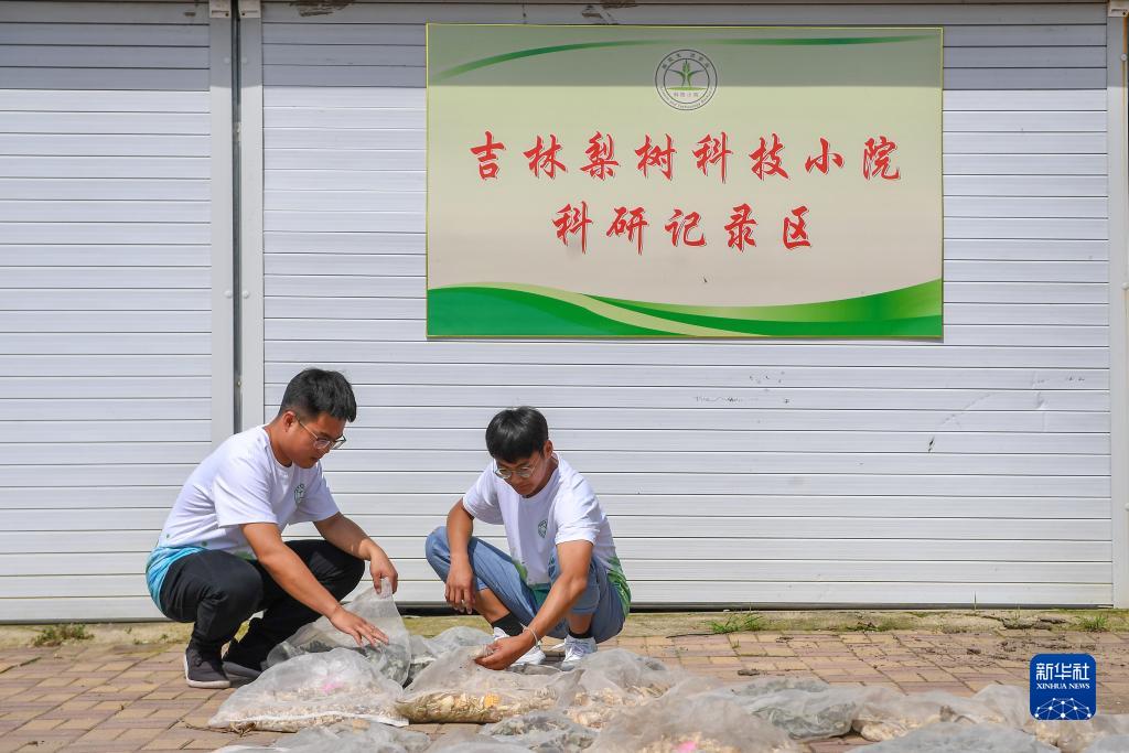 8月10日,在位于吉林省四平市梨樹縣的中國農業大學“科技小院”,在讀博士生沙野(左)和在讀碩士生高銘陽查看作物樣本。