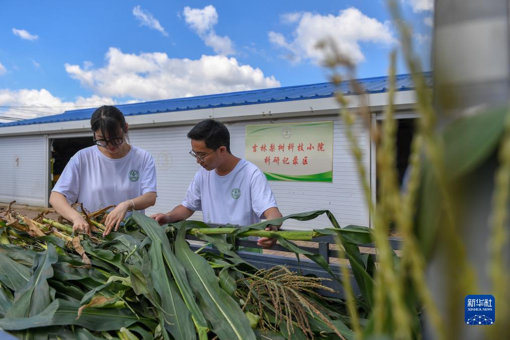 8月10日,在位于吉林省四平市梨樹縣的中國農業大學“科技小院”,在讀博士生胡文朗(右)和在讀碩士生張凈然查看作物樣本。