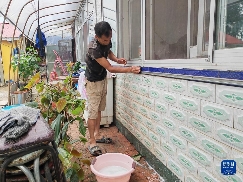 8月11日,黑龍江省尚志市元寶鎮元寶村村民在清理洪水過后留在房屋墻壁上的淤泥。