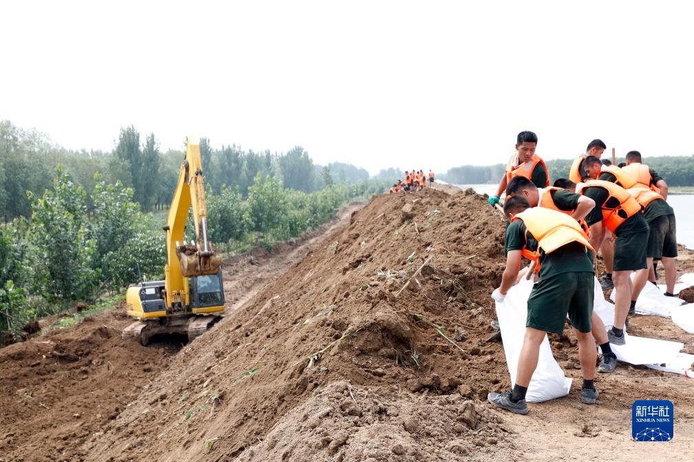8月11日,武警第一機動總隊某支隊官兵在裝填用于加固堤壩的沙袋。
